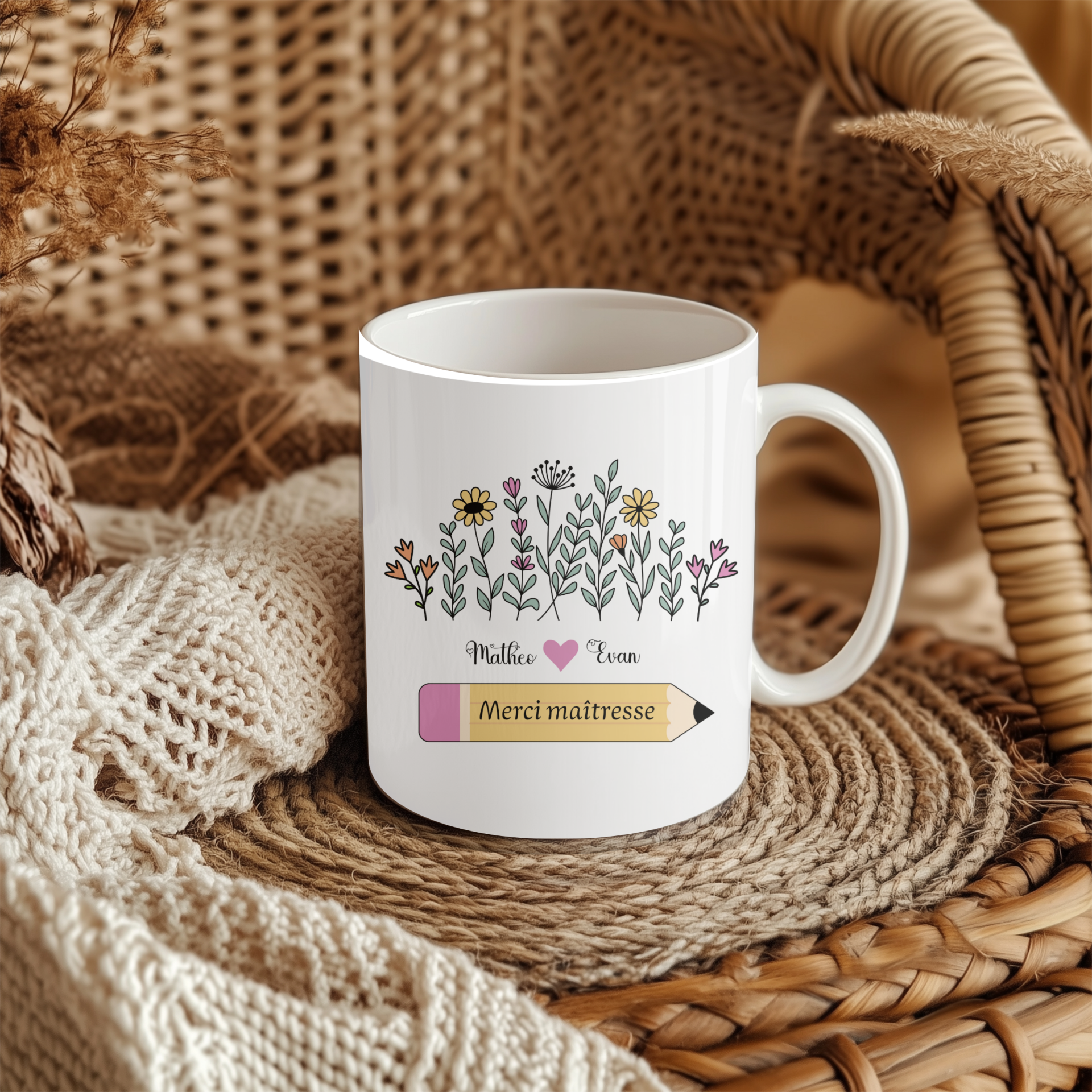 Mug personnalisé pour maitresse, ATSEM, AESH, personnalisé pour cadeaux de remerciements en fin d’année.